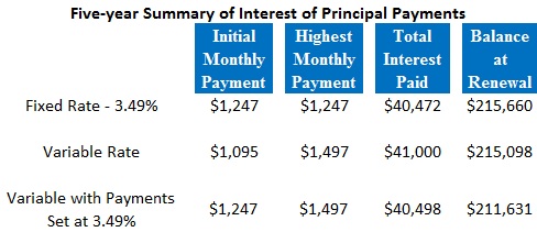 Just as we did last time, we’ll take a mortgage of $250,000, amortized over 25 years, and compare the cost of a five-year fixed rate at 3.49% to a five-year variable rate that starts at 2.30%. Each simulation will include a fixed-rate borrower, a variable-rate borrower who makes the minimum payment, and a variable-rate borrower who sets his initial payment at the fixed rate (we’ll call him Mr. Smarty Pants).