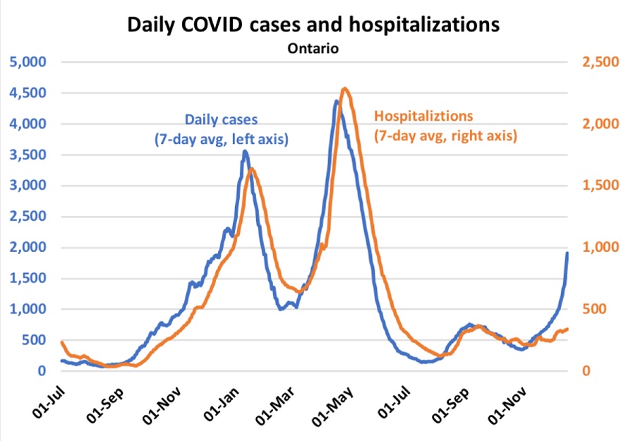 Our infection rates have spiked, but thus far, thankfully, hospitalizations have not followed suit (see Ontario chart below, courtesy of Ben Rabidoux).