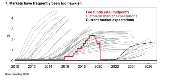 The bond market also errs consistently to the high side when forecasting the Fed’s policy rate, as the chart below illustrates.