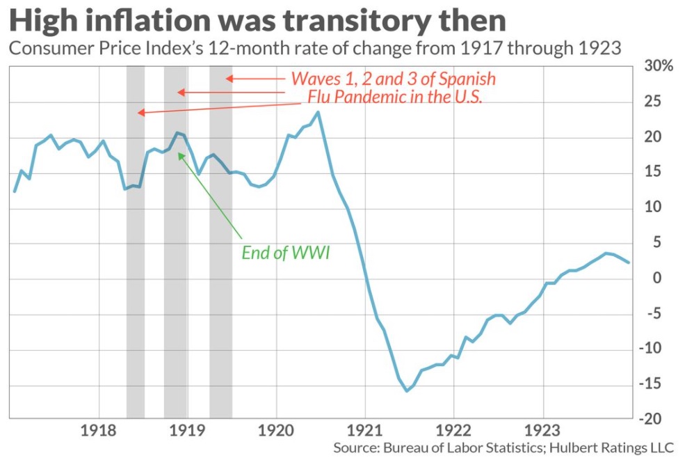 The following chart shows inflation averaging between 15% to 20% over the period from 1917 to 1920, before plunging to negative numbers in 1921-1922, and then hovering in the 2% range for the decade that followed.