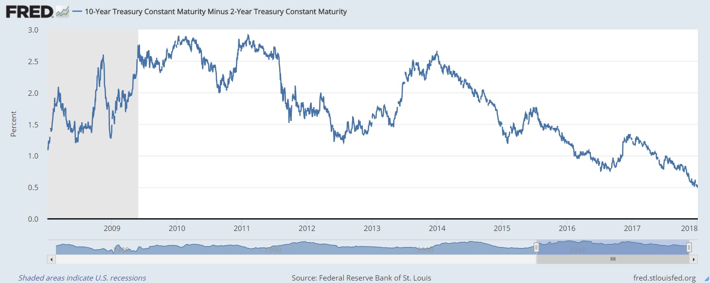 Another indication that bond investors aren’t overly concerned about significantly higher inflation can be found in the spread between U.S. two-year and ten-year bond yields. If investors are worried about higher inflation, this spread should widen, because rising inflation will have a greater impact on longer term bond yields. Interestingly, today the spread between two-year and ten-year U.S. bond yields is the lowest it has been in almost ten years, at 0.50%, and that’s about half of its long-term average of 0.97%.