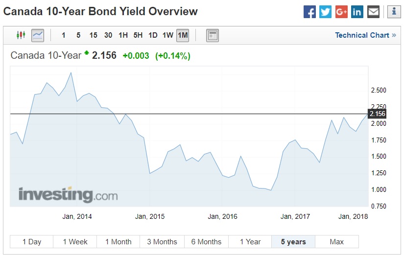 Today, our overall inflation rate, as measured by the Consumer Price Index (CPI), stands at 2.1%, which is a little above the Bank of Canada (BoC) target rate of 2%. The Bank’s more detailed inflation gauges have also crept up of late and aren’t too far away from their 2% targets. Furthermore, these trends jibe with the BoC’s belief that our economy is now operating very near to its full capacity.