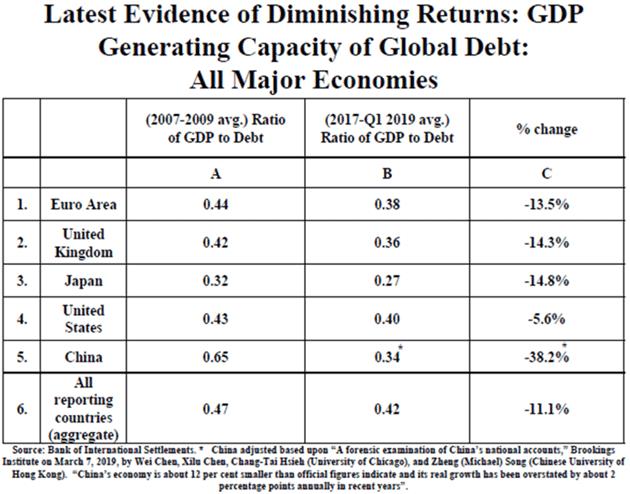 Worse still, the more debt an economy has, the less stimulative impact each newly borrowed dollar produces. This chart from a recent John Mauldin newsletter shows how debt’s impact on GDP has shrunk in each of the world’s largest economies over the past ten years: