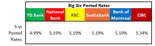 Here is a chart showing the Big Six’s current five-year posted rates: