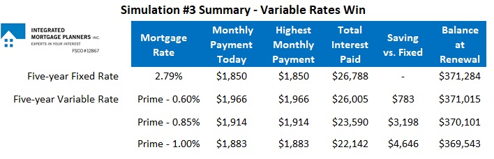 Each simulation will assume that you either convert to a competitively priced five-year fixed rate at 2.79% today, or stay the course with one of three different variable rates: