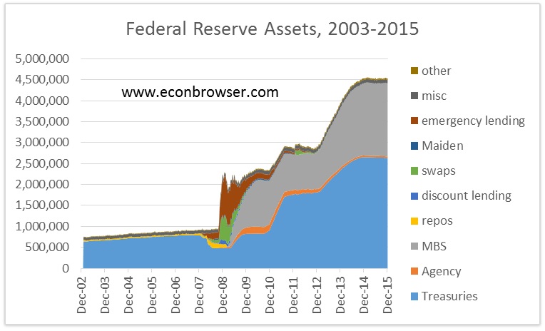 These risks are magnified today by the sheer scale of QE that has been used since 2008. For example, the graph below (courtesy of www.econbrowser.com) shows the amount and type of assets that were purchased by the U.S. Federal Reserve between 2008 and 2015 causing its balance sheet to explode from $500 billion to $4.5 trillion.