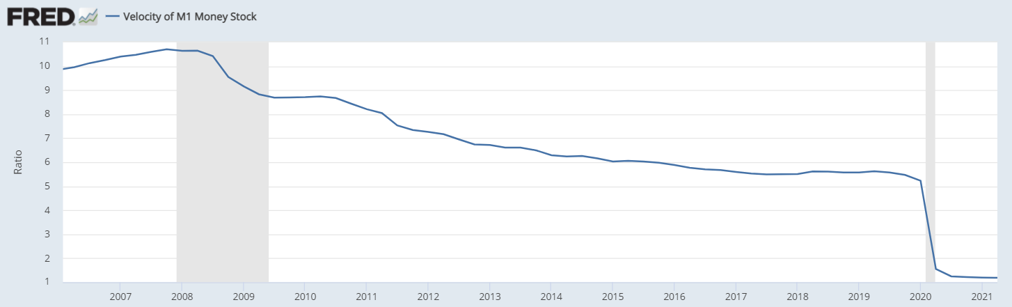 It shows the rate at which M1, which is the supply of US money, has been circulating through the US economy, referred to as the velocity of money. Note that it has fallen steadily since the Great Recession in 2008 and sharply since the start of the pandemic.