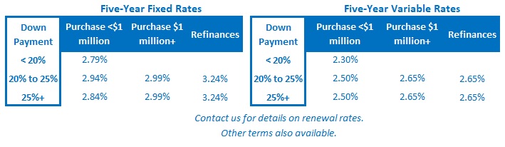 The chart below shows the five-year fixed and variable rates that are currently available for different down payment amounts and transaction types. (This chart replaces my usual two paragraphs outlining current rate conditions.) It should also be noted that lender terms and conditions vary, and can significantly impact the total cost of a mortgage over time.