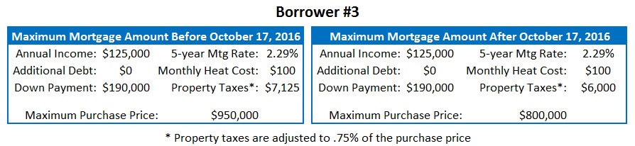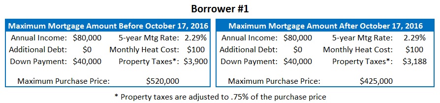 Borrower #1 is a fairly typical first-time buyer. He is putting down less than 10% of the purchase price and the MQR change will lower his maximum purchase price by 18%, from $520,000 to $425,000.