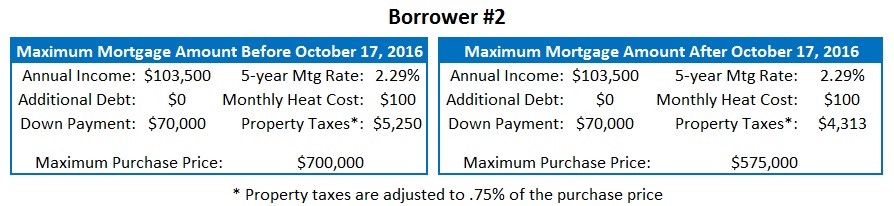 Borrower #2 could either be a first-time buyer at the higher end, or perhaps someone who is moving from a condo to a house. She is putting down about 15% of the purchase price and the MQR change will once again lower her maximum purchase price by 18%, from $700,000 to $575,000.